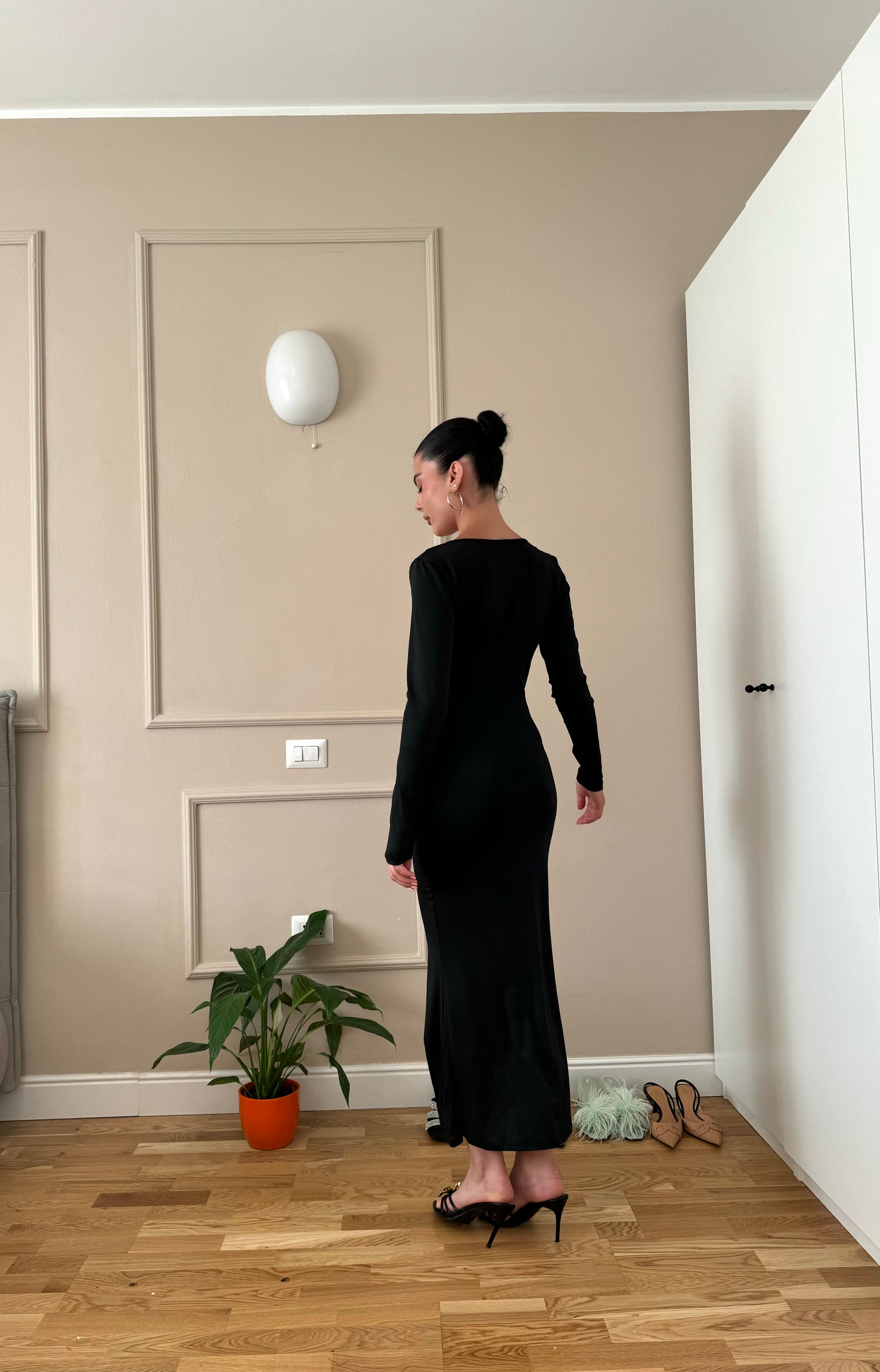 Vestito lungo nero con scollatura a V.